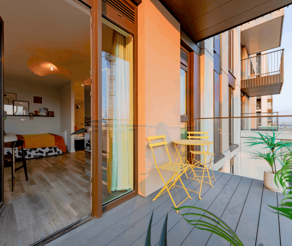 Each apartment is thoughtfully designed with full-height windows, integrated appliances, and a private balcony. You’ll also have a 24-hour concierge, estate management, and a 15th floor communal roof terrace.